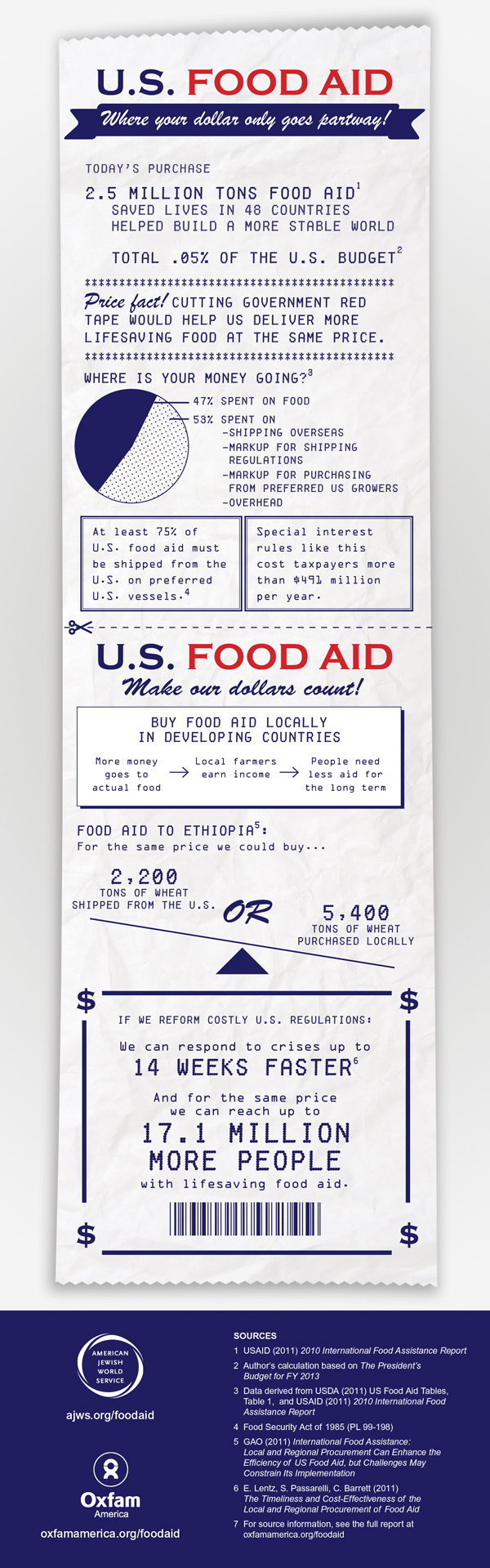 But what can we do to tackle such huge problems? I mean, practically, what can we do? Certainly, we can donate. I think we owe that to the people we share this planet with. We can (and must) also tackle the systemic problems, including those problems surrounding the very way that we as a country try to help others. Here is just one of them: The way by which we help people in the world can often be clouded by self-interests. Once again – we’re human. If we can help people in a way that will also help ourselves, why not? The problem is that sometimes we help ourselves at the expense of others. The way U.S. food aid works is a prime example. Currently, for every dollar we spend on food aid, only 47 cents is spent on the actual food! I believe exclamation marks were invented for sentences like that. A new infographic (see below) we produced at Oxfam America with the American Jewish World Service (I use ‘we’ loosely because I had nothing to do with the production part) illustrates just how screwed up the food aid system is, and also points to the solution; buy food locally in developing countries! Our dollars would go twice as far, which means they would help twice as much. The technical term for that is no-brainer. Oh, and guess what? Not only does that mean more food gets to people who need it, it also means we’re supporting farmers in these countries, so that they can address the long-term problem of food production.
